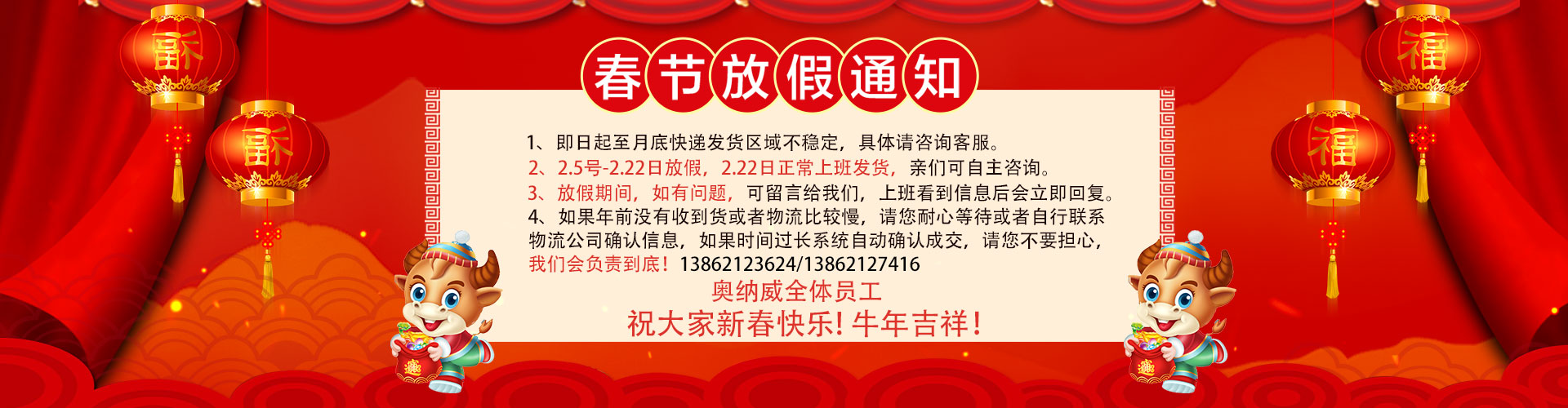 尊敬的客戶,您好,結(jié)合疫情進展情況以及本公司的政策,現(xiàn)將本公司2021年年假及春節(jié)放假安排:2021年2月5日---2021年2月19日(正月初八),放假期間安裝及售后暫停服務(wù),業(yè)務(wù)咨詢正常溝通,感謝新老客戶在2020年對本公司的信任和大力支持,2021年將更加努力把最優(yōu)質(zhì)的服務(wù)給到到客戶,放假期間聯(lián)系電話:13862123624,在此奧納威全體員工提前祝各位老板春節(jié)快樂,財源廣進!